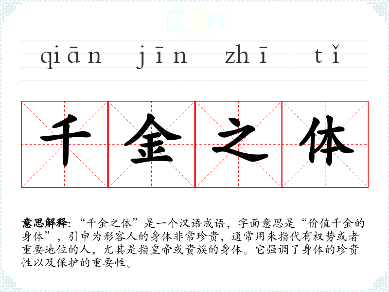 “千金之体”最早出现在《礼记·大学》中,原文为“君子之体,千金之重”。这个成语源于古代对君主身体的极度重视,反映了当时社会对统治者的关注与崇敬。在古代,君主的身体被视为国家的象征,因此需要特别的保护与照顾。