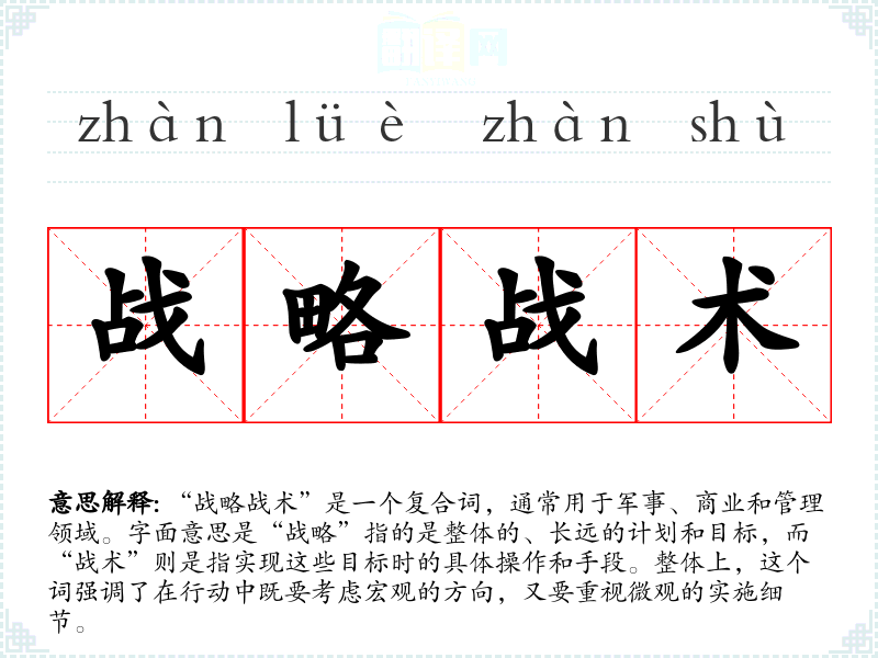 “战略战术”是一个复合词,通常用于军事、商业和管理领域。字面意思是“战略”指的是整体的、长远的计划和目标,而“战术”则是指实现这些目标时的具体操作和手段。整体上,这个词强调了在行动中既要考虑宏观的方向,又要重视微观的实施细节。