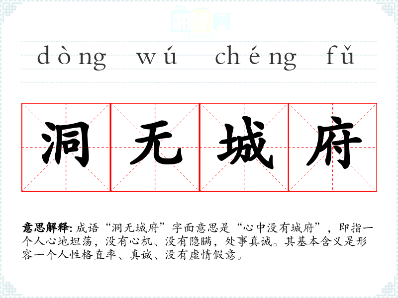 成语“洞无城府”字面意思是“心中没有城府”,即指一个人心地坦荡,没有心机、没有隐瞒,处事真诚。其基本含义是形容一个人性格直率、真诚、没有虚情假意。
