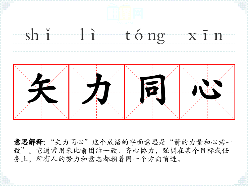“矢力同心”这个成语的字面意思是“箭的力量和心意一致”。它通常用来比喻团结一致、齐心协力,强调在某个目标或任务上,所有人的努力和意志都朝着同一个方向前进。