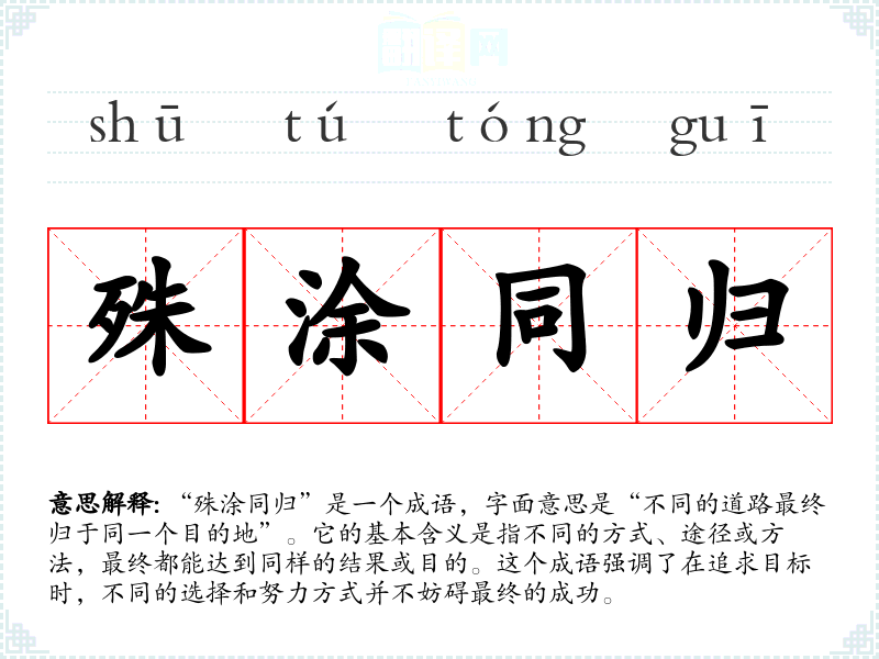 “殊涂同归”是一个成语,字面意思是“不同的道路最终归于同一个目的地”。它的基本含义是指不同的方式、途径或方法,最终都能达到同样的结果或目的。这个成语强调了在追求目标时,不同的选择和努力方式并不妨碍最终的成功。