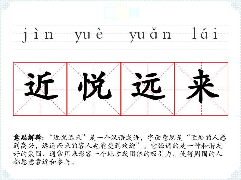 “近悦远来”是一个汉语成语,字面意思是“近处的人感到高兴,远道而来的客人也能受到欢迎”。它强调的是一种和谐友好的氛围,通常用来形容一个地方或团体的吸引力,使得周围的人都愿意靠近和参与。