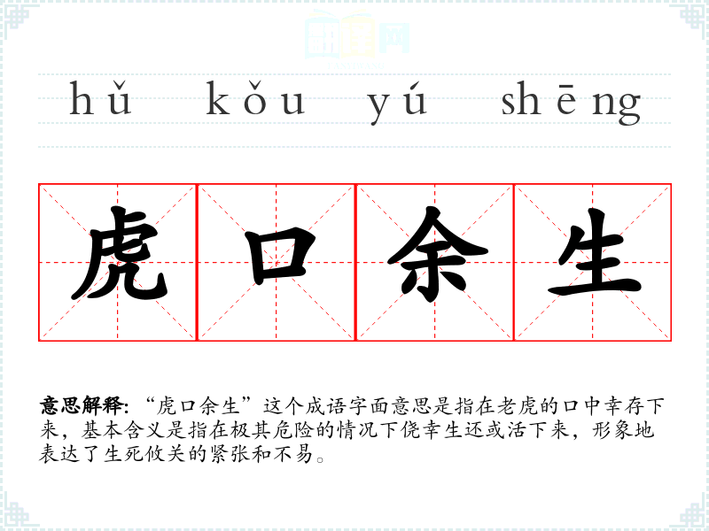 “虎口余生”这个成语字面意思是指在**的口中幸存下来,基本含义是指在极其危险的情况下侥幸生还或活下来,形象地表达了生死攸关的紧张和不易。