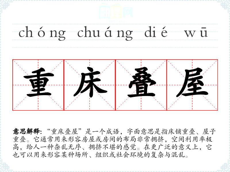 “重床叠屋”是一个成语,字面意思是指床铺重叠、屋子重叠。它通常用来形容房屋或房间的布局非常拥挤,空间利用率极高,给人一种杂乱无序、拥挤不堪的感觉。在更广泛的意义上,它也可以用来形容某种场所、组织或社会环境的复杂与混乱。