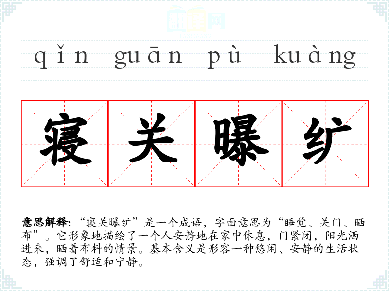 “寝关曝纩”是一个成语,字面意思为“睡觉、关门、晒布”。它形象地描绘了一个人安静地在家中休息,门紧闭,阳光洒进来,晒着布料的情景。基本含义是形容一种悠闲、安静的生活状态,强调了舒适和宁静。