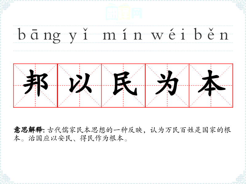 | 邦以民为本 | 古代儒家民本思想的一种反映,认为万民百姓是国家的根本。治国应以安民、得民作为根本。 |