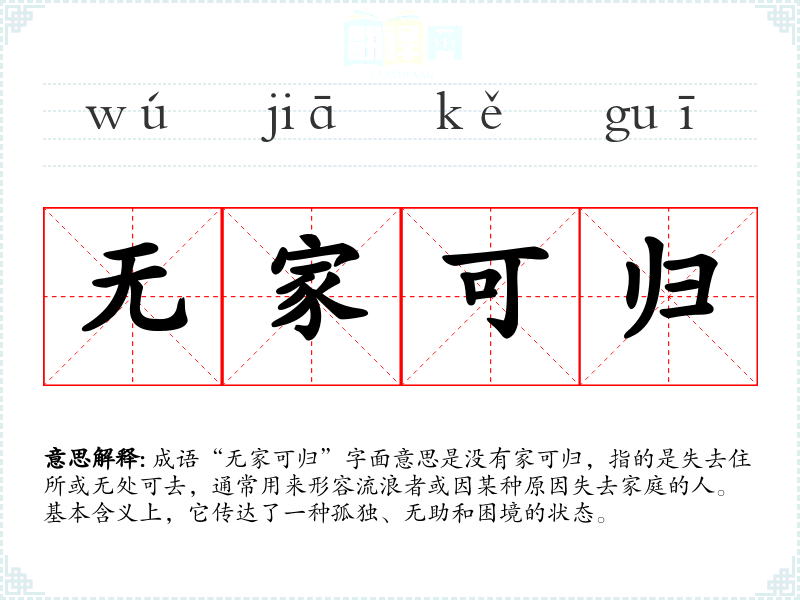 “无家可归”并没有特定的历史典故,但它反映了社会中流浪与失去家庭的普遍现象。在历史上,战争、自然灾害或社会动荡常常导致人们失去家园,这个成语由此而生,体现了人们对家和安全感的渴望。