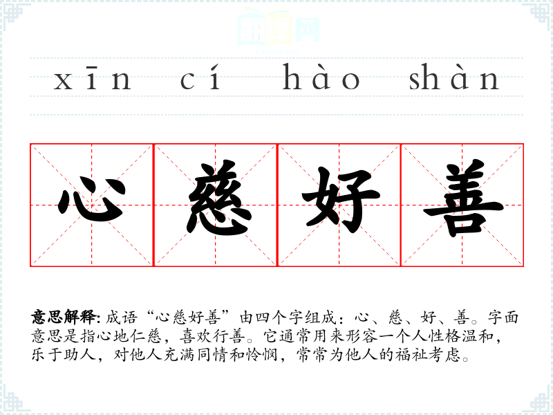 成语“心慈好善”由四个字组成:心、慈、好、善。字面意思是指心地仁慈,喜欢行善。它通常用来形容一个人性格温和,乐于助人,对他人充满同情和怜悯,常常为他人的福祉考虑。
