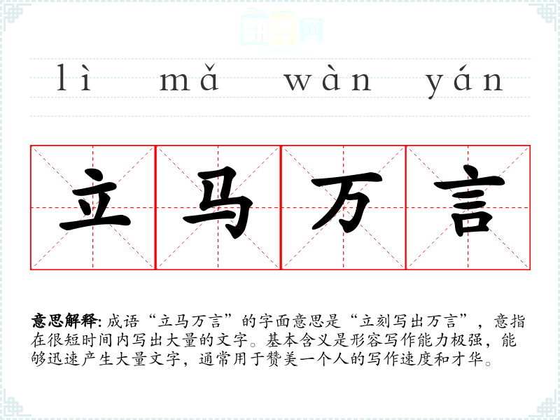 成语“立马万言”的字面意思是“立刻写出万言”,意指在很短时间内写出大量的文字。基本含义是形容写作能力极强,能够迅速产生大量文字,通常用于赞美一个人的写作速度和才华。
