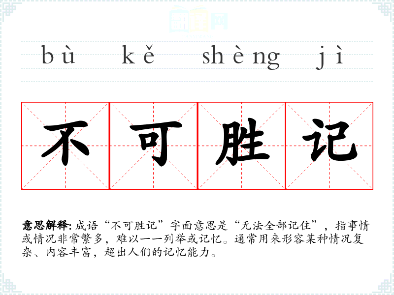 成语“不可胜记”字面意思是“无法全部记住”,指事情或情况非常繁多,难以一一列举或记忆。通常用来形容某种情况复杂、内容丰富,超出人们的记忆能力。