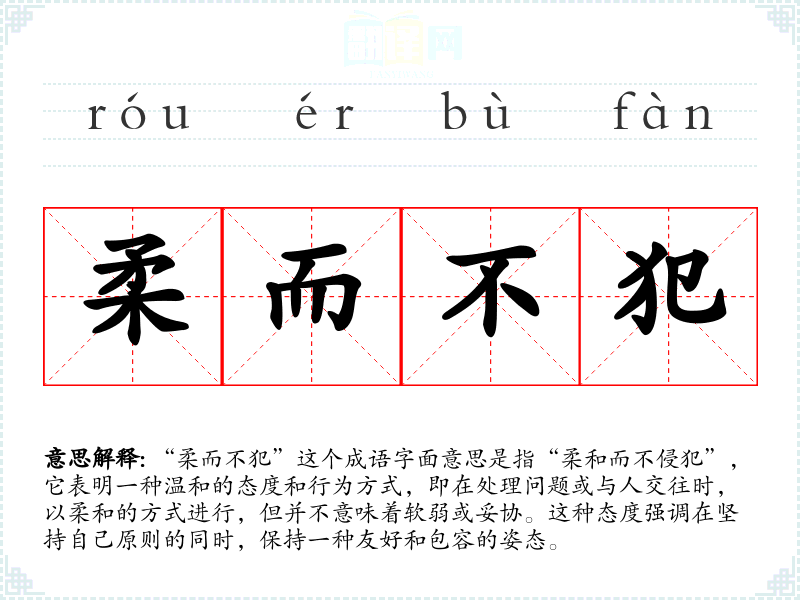 “柔而不犯”这个成语字面意思是指“柔和而不侵犯”,它表明一种温和的态度和行为方式,即在处理问题或与人交往时,以柔和的方式进行,但并不意味着软弱或妥协。这种态度强调在坚持自己原则的同时,保持一种友好和包容的姿态。