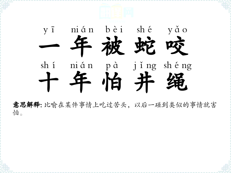 一次被蛇咬了,看见井边断了的绳子也害怕。比喻在某事上吃了苦头,以后碰到类似的情况也会害怕 |