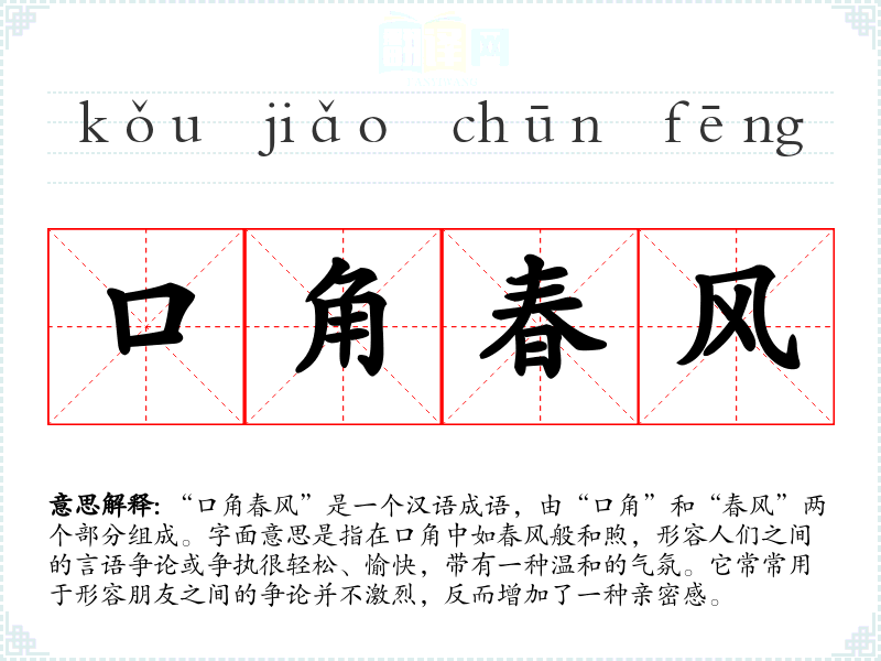 “口角春风”是一个汉语成语,由“口角”和“春风”两个部分组成。字面意思是指在口角中如春风般和煦,形容人们之间的言语争论或争执很轻松、愉快,带有一种温和的气氛。它常常用于形容朋友之间的争论并不激烈,反而增加了一种亲密感。