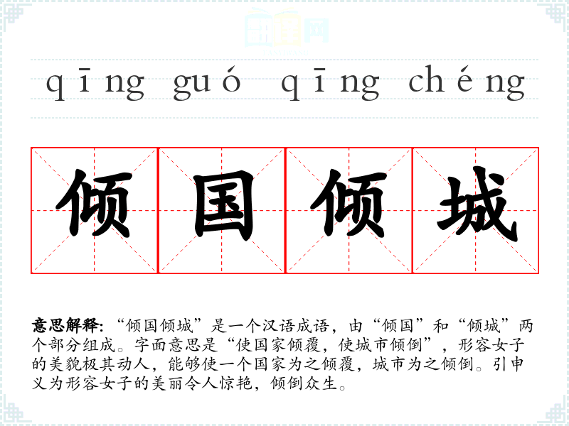 “倾国倾城”是一个汉语成语,由“倾国”和“倾城”两个部分组成。字面意思是“使国家倾覆,使城市倾倒”,形容女子的美貌极其动人,能够使一个国家为之倾覆,城市为之倾倒。引申义为形容女子的美丽令人惊艳,倾倒众生。