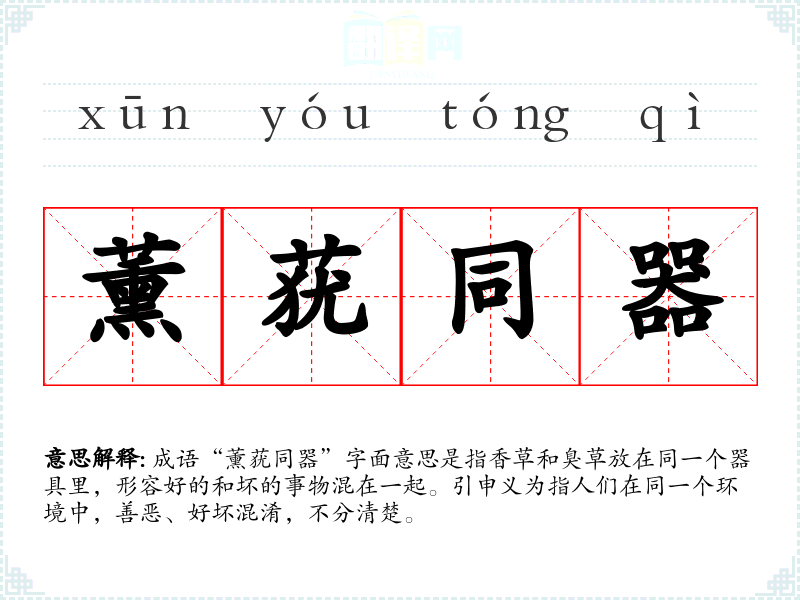 成语“薰莸同器”字面意思是指香草和臭草放在同一个器具里,形容好的和坏的事物混在一起。引申义为指人们在同一个环境中,善恶、好坏混淆,不分清楚。
