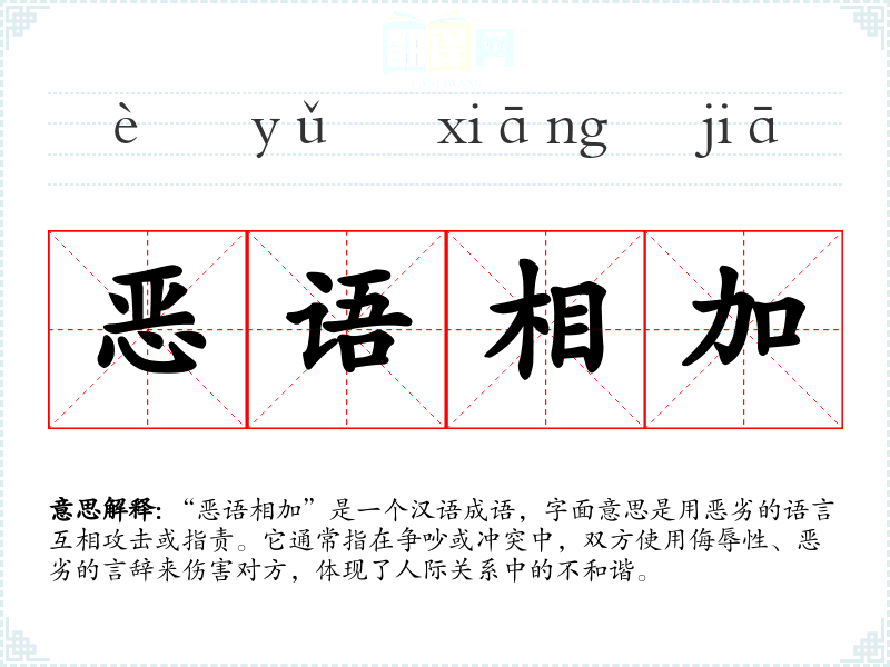 “恶语相加”是一个汉语成语,字面意思是用恶劣的语言互相攻击或指责。它通常指在争吵或冲突中,双方使用侮辱性、恶劣的言辞来伤害对方,体现了人际关系中的不和谐。