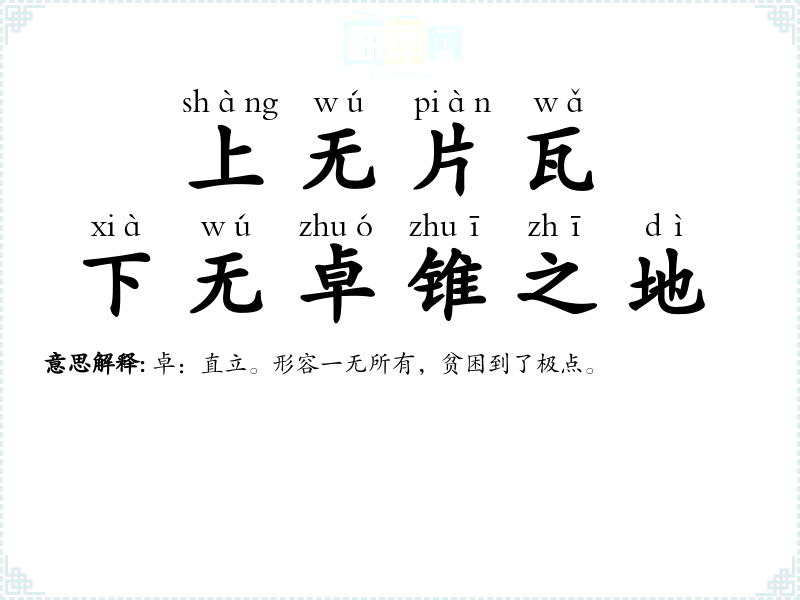 亡:无;立锥:插锥子。没有插锥尖的一点地方。形容极其贫困。 |