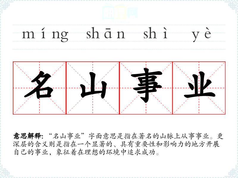 “名山事业”字面意思是指在著名的山脉上从事事业。更深层的含义则是指在一个显著的、具有重要性和影响力的地方开展自己的事业,象征着在理想的环境中追求成功。