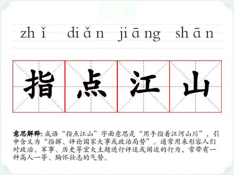 成语“指点江山”字面意思是“用手指着江河山川”,引申含义为“指挥、评论国家大事或政治局势”。通常用来形容人们对政治、军事、历史等宏大主题进行评述或阐述的行为,常带有一种高人一等、胸怀壮志的气势。