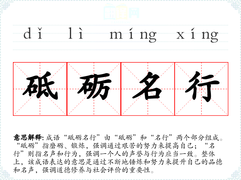 成语“砥砺名行”由“砥砺”和“名行”两个部分组成。“砥砺”指磨砺、锻炼,强调通过艰苦的努力来提高自己;“名行”则指名声和行为,强调一个人的声誉与行为应当一致。整体上,该成语表达的意思是通过不断地锤炼和努力来提升自己的品德和名声,强调道德修养与社会评价的重要性。