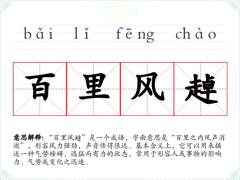 “百里风趠”是一个成语,字面意思是“百里之内风声消逝”,形容风力强劲,声音传得很远。基本含义上,它可以用来描述一种气势磅礴、迅猛而有力的状态,常用于形容人或事物的影响力、气势或变化之迅速。