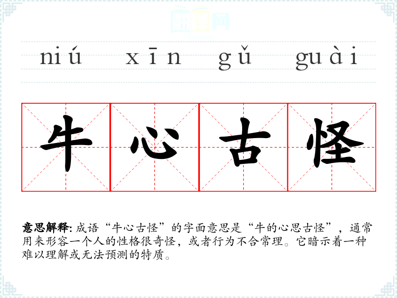 成语“牛心古怪”的字面意思是“牛的心思古怪”,通常用来形容一个人的性格很奇怪,或者行为不合常理。它暗示着一种难以理解或无法预测的特质。