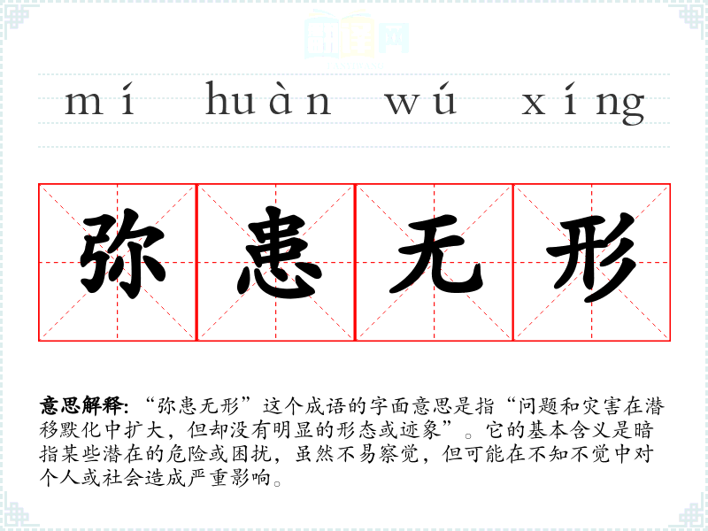 “弥患无形”这个成语的字面意思是指“问题和灾害在潜移默化中扩大,但却没有明显的形态或迹象”。它的基本含义是暗指某些潜在的危险或困扰,虽然不易察觉,但可能在不知不觉中对个人或社会造成严重影响。
