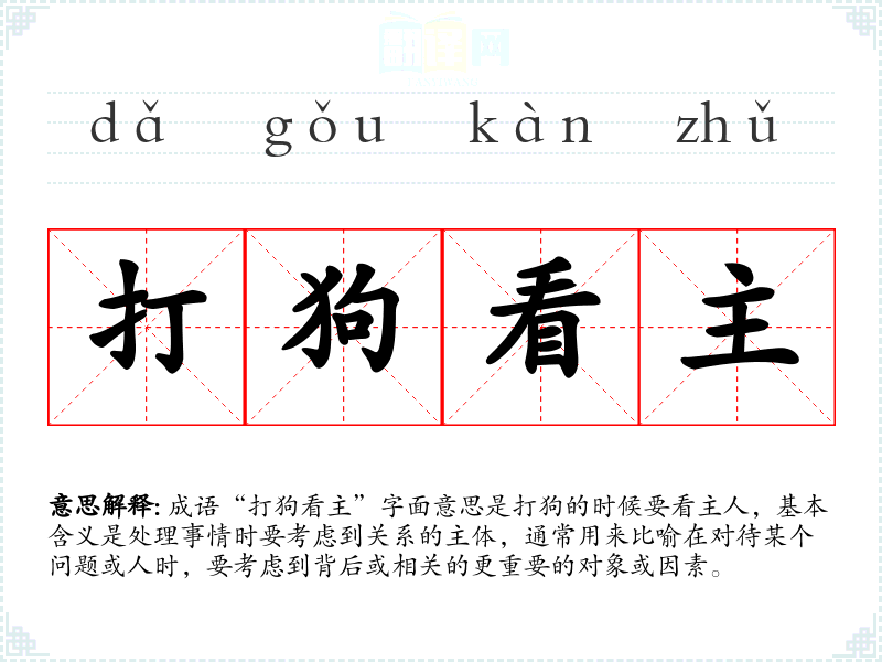 成语“打狗看主”字面意思是打狗的时候要看主人,基本含义是处理事情时要考虑到关系的主体,通常用来比喻在对待某个问题或人时,要考虑到背后或相关的更重要的对象或因素。