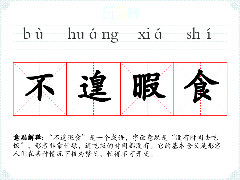 | 不遑暇食 | 没有时间吃饭。形容工作紧张、辛勤。 |