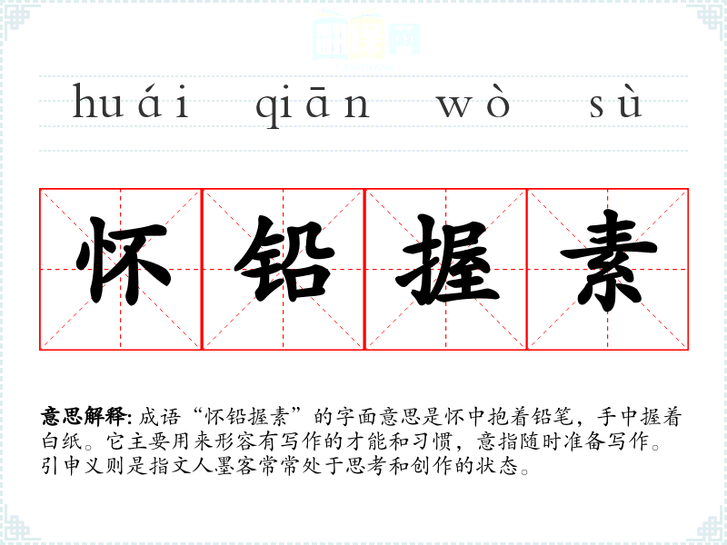 成语“怀铅握素”的字面意思是怀中抱着铅笔,手中握着白纸。它主要用来形容有写作的才能和*惯,意指随时准备写作。引申义则是指文人墨客常常处于思考和创作的状态。