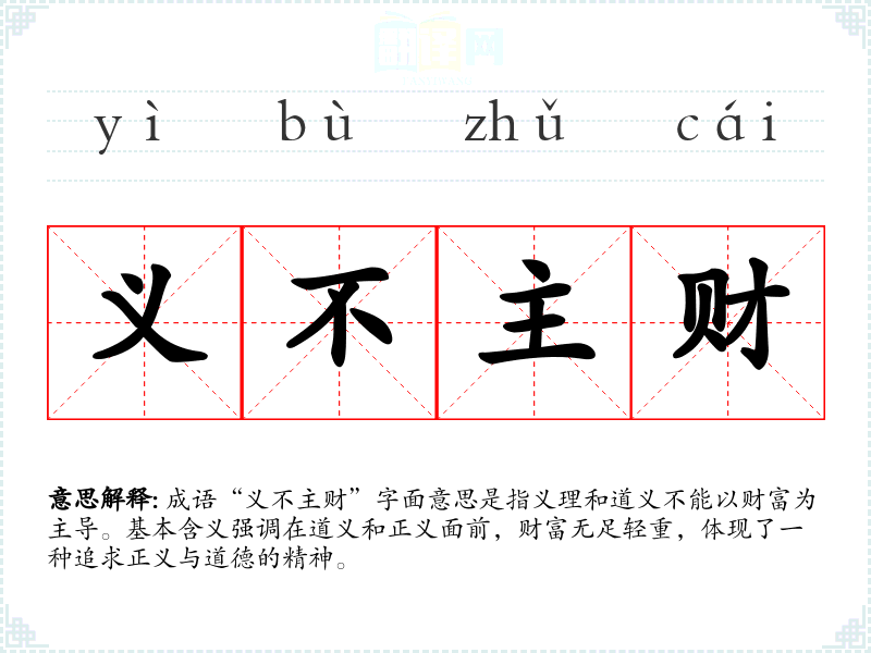 成语“义不主财”字面意思是指义理和道义不能以财富为主导。基本含义强调在道义和正义面前,财富无足轻重,体现了一种追求正义与道德的精神。