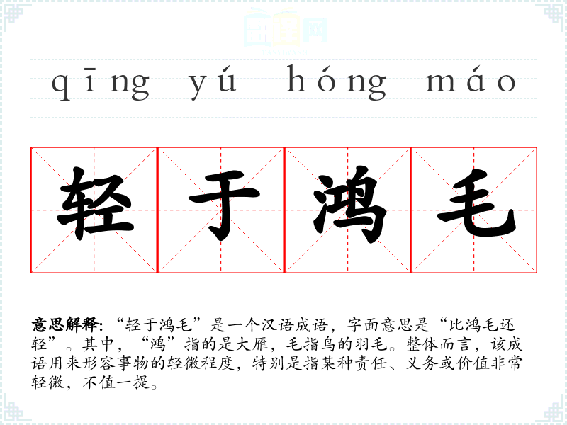 “轻于鸿毛”是一个汉语成语,字面意思是“比鸿毛还轻”。其中,“鸿”指的是大雁,毛指鸟的羽毛。整体而言,该成语用来形容事物的轻微程度,特别是指某种责任、义务或价值非常轻微,不值一提。