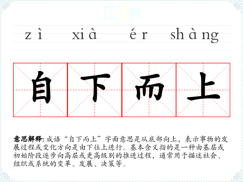 成语“自下而上”字面意思是从底部向上,表示事物的发展过程或变化方向是由下往上进行。基本含义指的是一种由基层或初始阶段逐步向高层或更高级别的推进过程,通常用于描述社会、组织或系统的变革、发展、决策等。