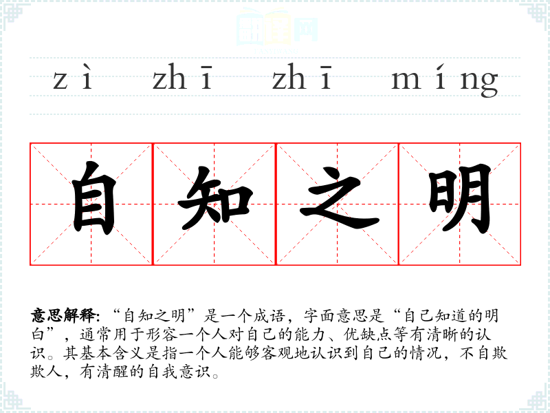 “自知之明”是一个成语,字面意思是“自己知道的明白”,通常用于形容一个人对自己的能力、优缺点等有清晰的认识。其基本含义是指一个人能够客观地认识到自己的情况,不自欺欺人,有清醒的自我意识。
