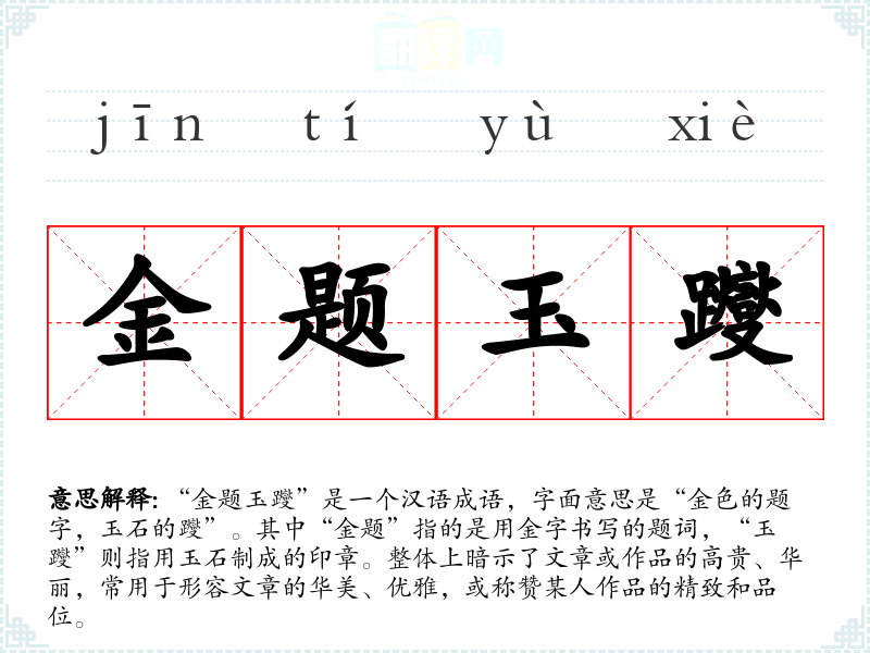 “金题玉躞”是一个汉语成语,字面意思是“金色的题字,玉石的躞”。其中“金题”指的是用金字书写的题词,“玉躞”则指用玉石制成的印章。整体上暗示了文章或作品的高贵、华丽,常用于形容文章的华美、优雅,或称赞某人作品的精致和品位。