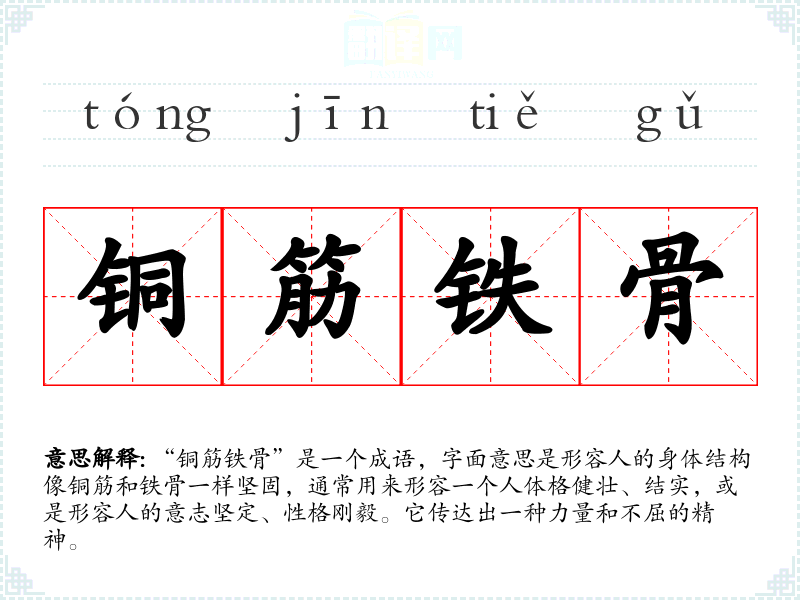 “铜筋铁骨”是一个成语,字面意思是形容人的身体结构像铜筋和铁骨一样坚固,通常用来形容一个人体格健壮、结实,或是形容人的意志坚定、性格刚毅。它传达出一种力量和不屈的精神。