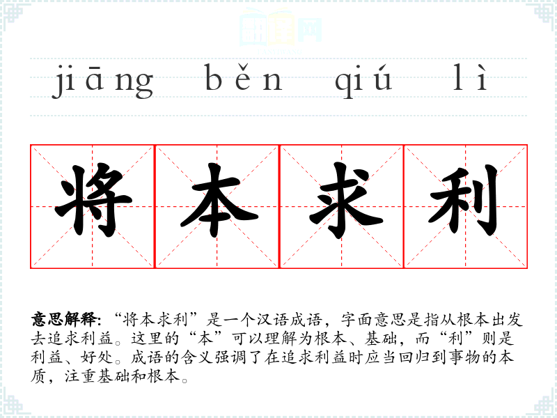 “将本求利”是一个汉语成语,字面意思是指从根本出发去追求利益。这里的“本”可以理解为根本、基础,而“利”则是利益、好处。成语的含义强调了在追求利益时应当回归到事物的本质,注重基础和根本。
