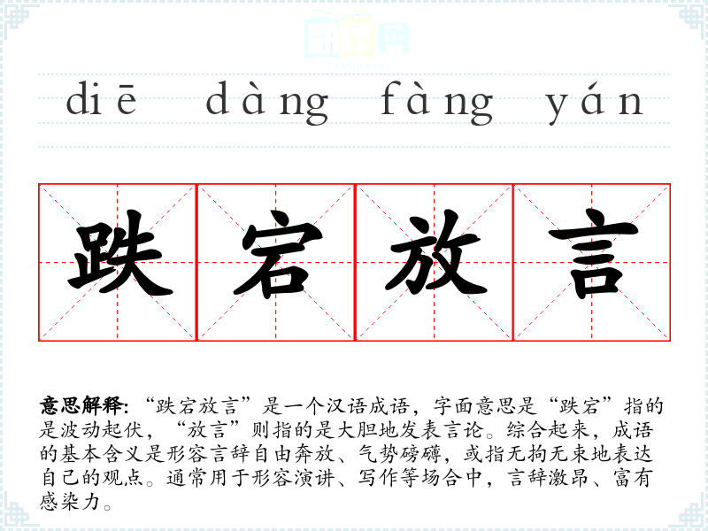 “跌宕放言”常给人一种激昂、振奋的情感体验,联想到那些慷慨激昂的演说家、作家,甚至是历史上的风云人物。它体现了一种勇于表达的精神,鼓励人们在合适的时机大胆说出自己的想法。
