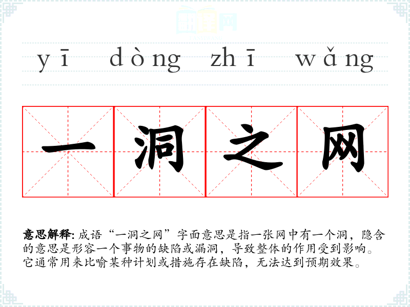 成语“一洞之网”字面意思是指一张网中有一个洞,隐含的意思是形容一个事物的缺陷或漏洞,导致整体的作用受到影响。它通常用来比喻某种计划或措施存在缺陷,无法达到预期效果。