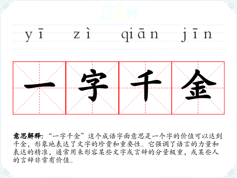 “一字千金”这个成语字面意思是一个字的价值可以达到千金,形象地表达了文字的珍贵和重要性。它强调了语言的力量和表达的精准,通常用来形容某些文字或言辞的分量极重,或某些人的言辞非常有价值。