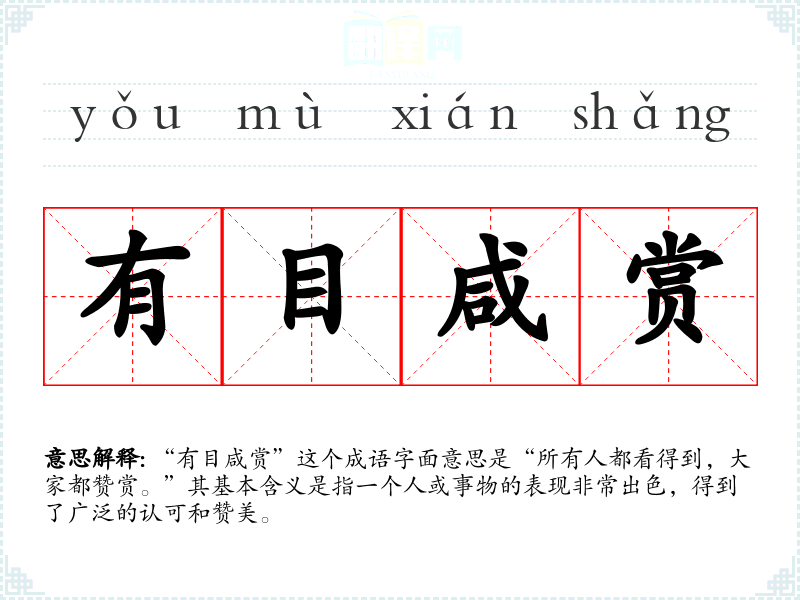 “有目咸赏”这个成语字面意思是“所有人都看得到,大家都赞赏。”其基本含义是指一个人或事物的表现非常出色,得到了广泛的认可和赞美。