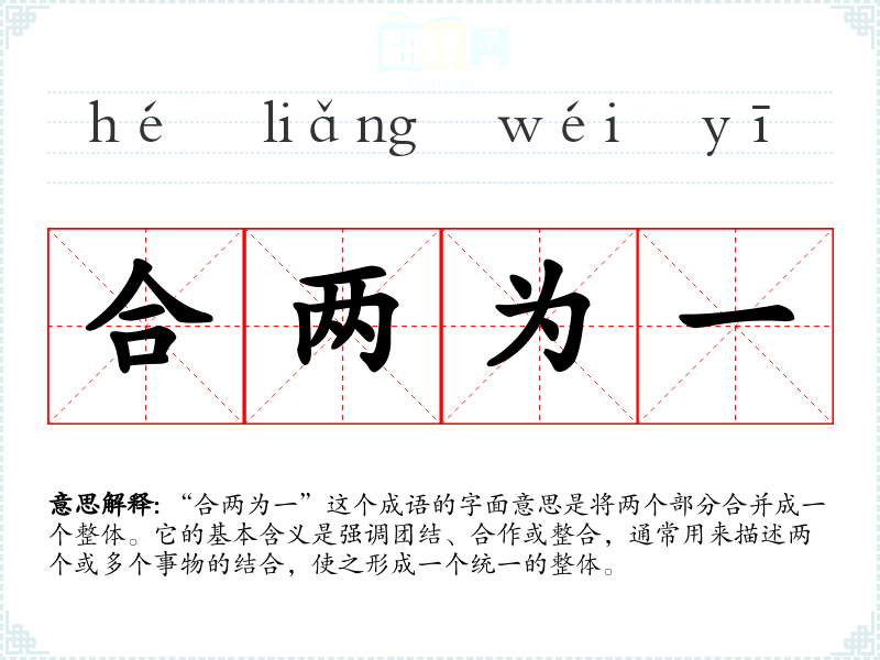 “合两为一”这个成语的字面意思是将两个部分合并成一个整体。它的基本含义是强调团结、合作或整合,通常用来描述两个或多个事物的结合,使之形成一个统一的整体。