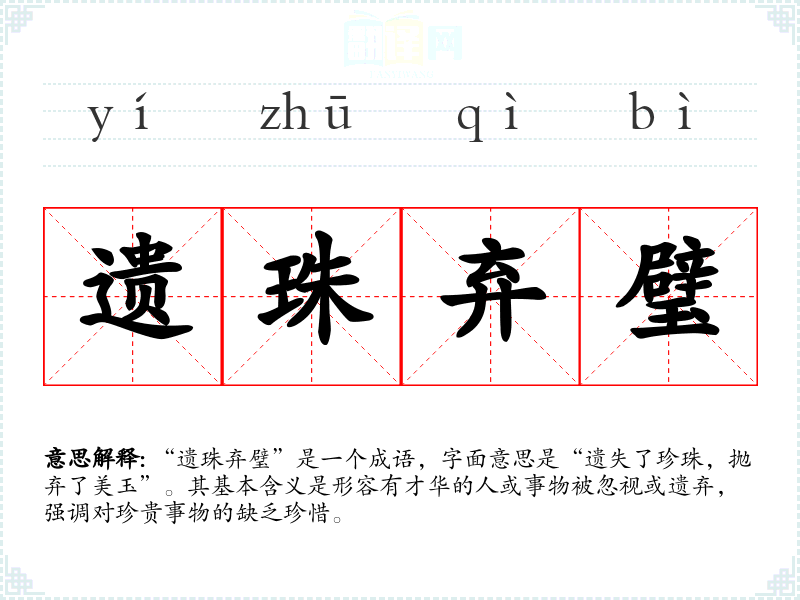 “遗珠弃璧”是一个成语,字面意思是“遗失了珍珠,抛弃了美玉”。其基本含义是形容有才华的人或事物被忽视或遗弃,强调对珍贵事物的缺乏珍惜。