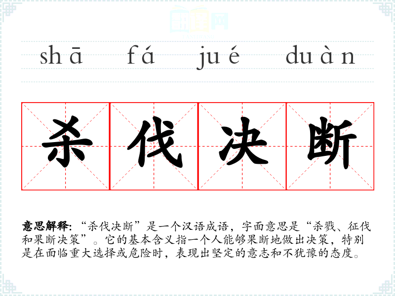“杀伐决断”是一个汉语成语,字面意思是“杀戮、征伐和果断决策”。它的基本含义指一个人能够果断地做出决策,特别是在面临重大选择或危险时,表现出坚定的意志和不犹豫的态度。