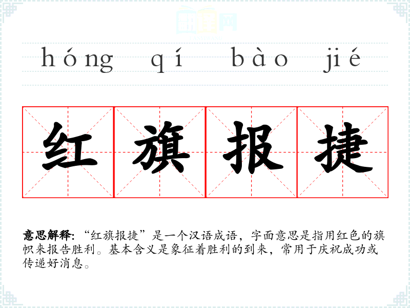 该成语源于古代军事活动,红色旗帜通常象征着胜利和庆祝。在古代战争中,胜利的消息常常通过旗帜传递,红色旗帜被赋予了胜利和荣誉的象征意义。因此,“红旗报捷”逐渐演变成表达胜利和成功的一种说法。