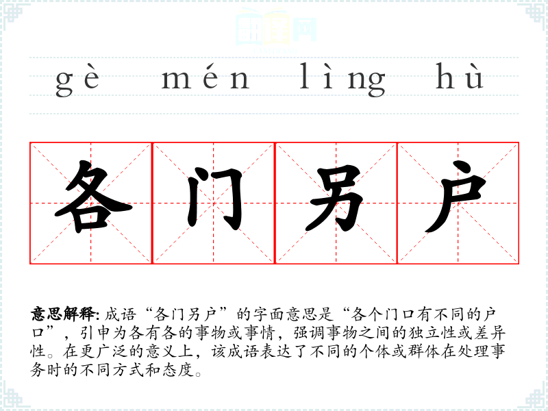 成语“各门另户”的字面意思是“各个门口有不同的户口”,引申为各有各的事物或事情,强调事物之间的独立性或差异性。在更广泛的意义上,该成语表达了不同的个体或群体在处理事务时的不同方式和态度。