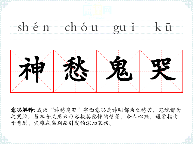 成语“神愁鬼哭”字面意思是神明都为之愁苦,鬼魂都为之哭泣。基本含义用来形容极其悲惨的情景,令人心痛,通常指由于悲剧、灾难或离别而引发的深切哀伤。