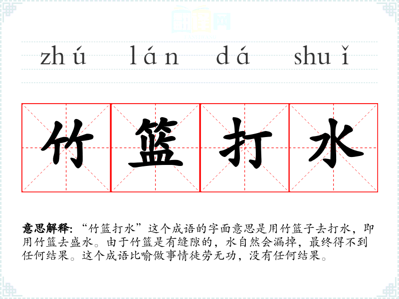 “竹篮打水”这个成语的字面意思是用竹篮子去打水,即用竹篮去盛水。由于竹篮是有缝隙的,水自然会漏掉,最终得不到任何结果。这个成语比喻做事情徒劳无功,没有任何结果。