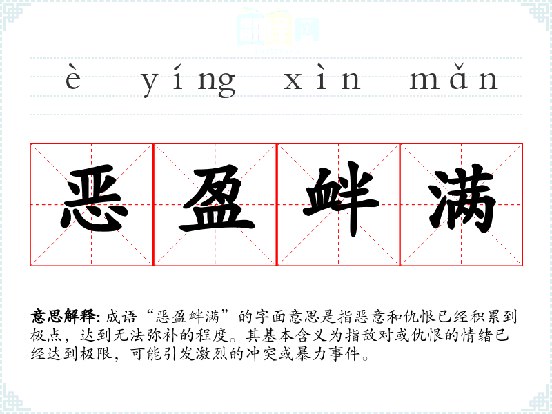 “恶盈衅满”出自古代典籍,具体的文献出处并不明确,但可以从成语的组成部分分析其来源。“恶”指恶意、仇恨;“盈”表示充满;“衅”是指矛盾、争端;“满”则强调达到极限。可以说,这个成语反映了历史上因仇恨而引发的冲突和争斗的普遍现象。
