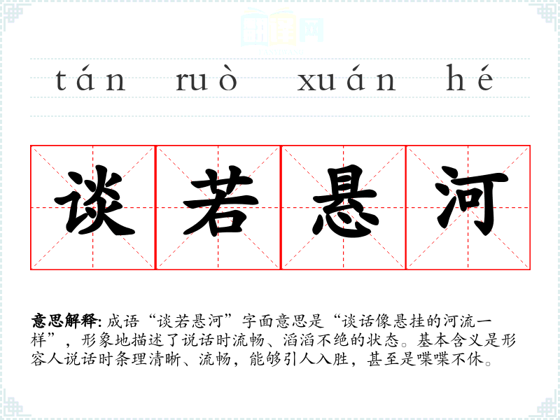 成语“谈若悬河”字面意思是“谈话像悬挂的河流一样”,形象地描述了说话时流畅、滔滔不绝的状态。基本含义是形容人说话时条理清晰、流畅,能够引人入胜,甚至是喋喋不休。